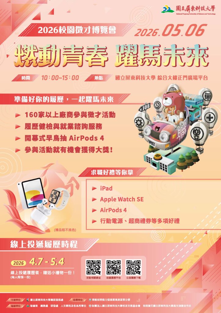無論你是即將畢業的準新鮮人、想轉換跑道的校友,或是正在探索未來方向的在校生,都誠摯邀請你一起參與這場屏東地區最大規模徵才活動!機會難得,千萬別錯過~一起為職涯加速,邁向理想未來 ![]()